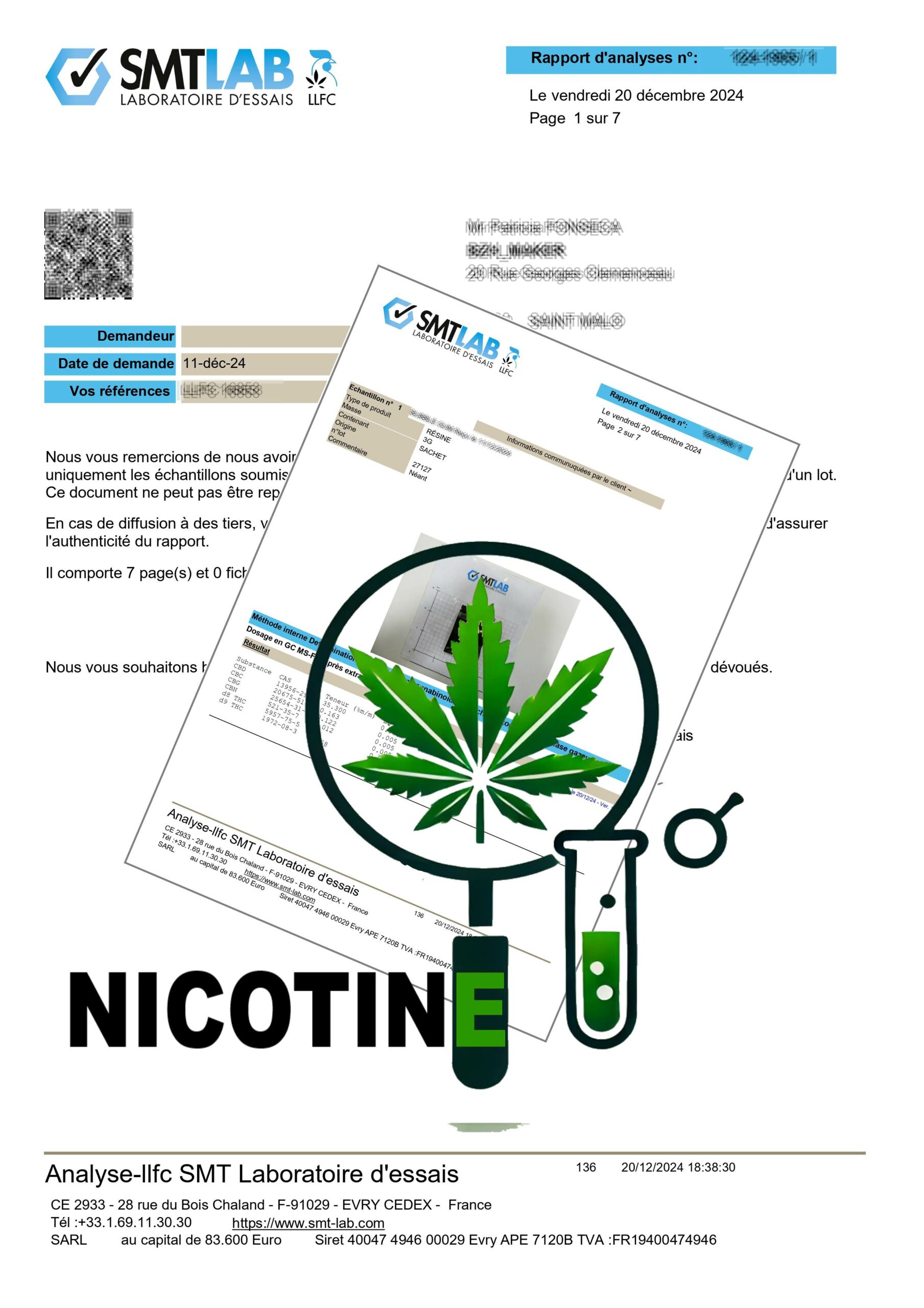 Nous pouvons vous remettre vos dosages en nicotine de tous types de matrice (E-liquide, tabac à chiquer, tabac à narguilé) dans un délai de 5 à 7 jours ouvrés.
